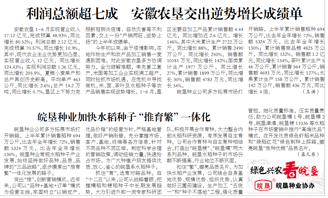皖墾種業(yè)在安徽日?qǐng)?bào)農(nóng)村版農(nóng)業(yè)周刊開辟“綠色興農(nóng)看皖墾”專欄