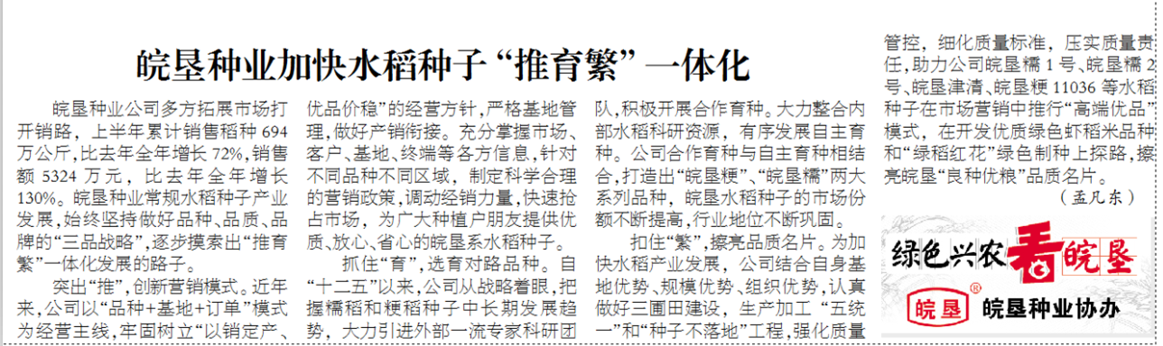 皖墾種業(yè)公司多方拓展市場打開銷路,上半年累計銷售稻種694萬公斤,比去年全年增長72%,銷售額5324萬元,比去年全年增長130%。皖墾種業(yè)常規(guī)水稻種子產業(yè)發(fā)展,始終堅持做好品種、品質、品牌的“三品戰(zhàn)略”,逐步摸索出“推育繁”一體化發(fā)展的路子。