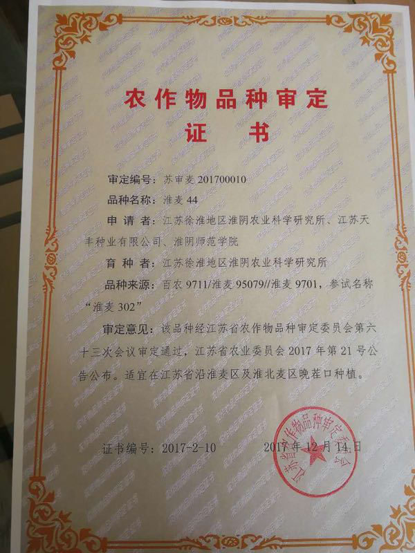 通過審定。適宜在江蘇省沿淮麥區(qū)及淮北麥區(qū)晚茬口種植